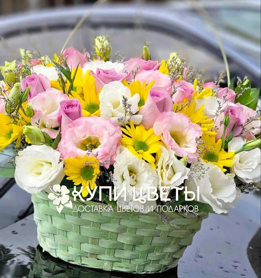 В этой уникальной корзине сплетаются воедино три неповторимых дара природы. Нежные, словно шелк, эустомы окутывают композицию воздушной грацией и утонченностью, добавляя ей легкость и невесомость. Рядом с ними, воплощая классическую красоту и глубокие чувства, царствуют великолепные розы. Их бархатистые лепестки, полные страсти и романтики, придают букету благородство и изысканность. А завершают эту царственную триаду пышные, стойкие хризантемы. Они добавляют композиции объем, текстуру и символизируют долголетие, счастье и изобилие, придавая букету законченный, роскошный вид.