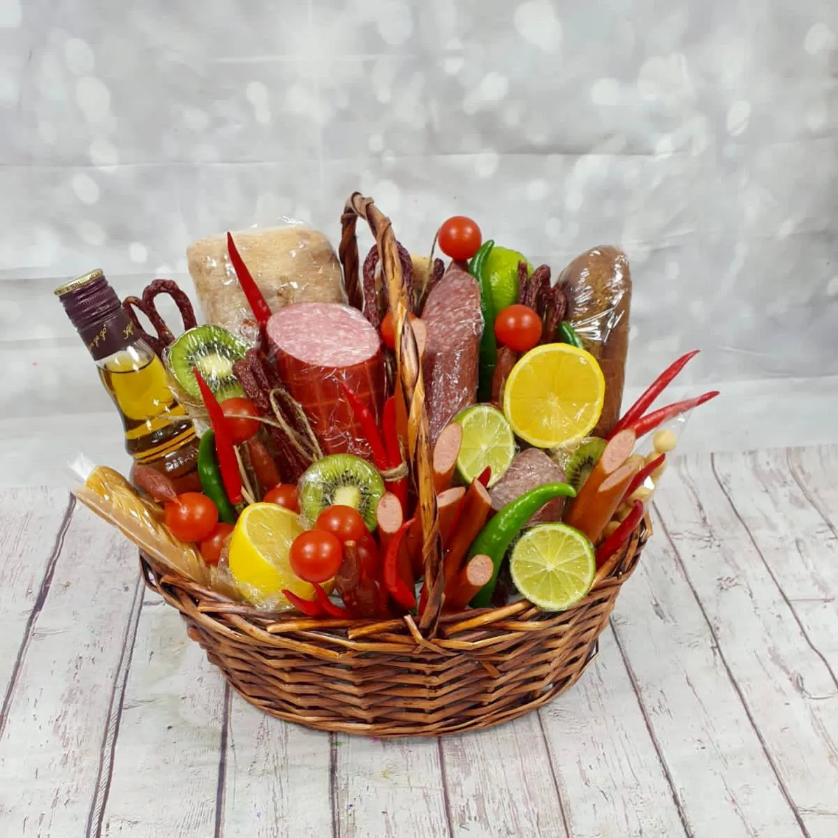 Состав: колбаса, хлеб, сыр, перец, огурцы, черри, лимоны, киви, колбаски ,корзина.