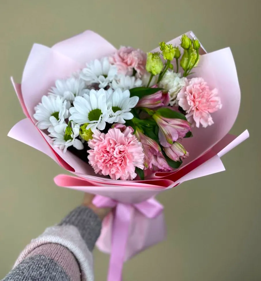 Представляем вашему вниманию восхитительный букет, который стал олицетворением нежности и утонченности. В его сердце расцветает ромашковая кустовая хризантема, придавая композиции яркие акценты и уютное очарование. Розовые альстромерии, словно облака веселья, эффектно обрамляют букет, даря ему легкость и трепет.