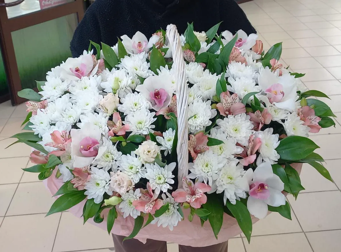 • Премиум (на фото) - хризантема кустовая - 7 шт. орхидея цимбидиум бутон - 7 шт. лизиантус - 3 шт.,кустовая роза-3 шт, зелень, оазис, корзина