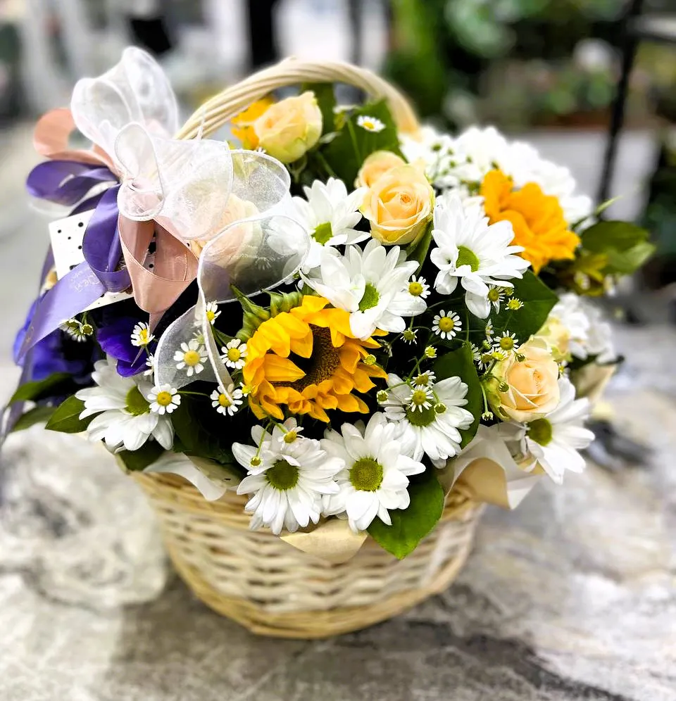 Идеально подходит для оформления праздников, свадеб или семейных торжеств, корзина с подсолнухами и кустовыми хризантемами создает атмосферу уюта и гармонии. Порадуйте себя и своих близких этим великолепным цветочным шедевром!