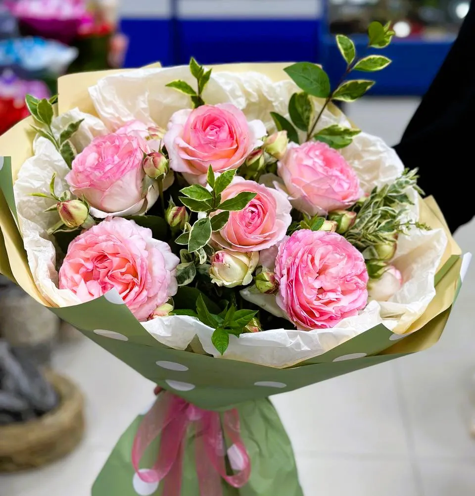пионовидные одноголовые розы, зелень, упаковка,лента