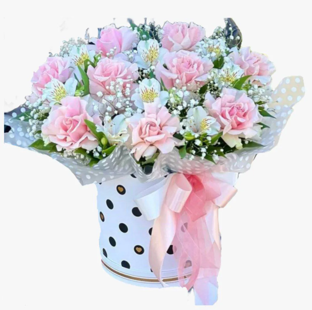Истинное олицетворение нежности и элегантности — шляпная коробка с розами, альстромерией и гипсофилой. Этот оригинальный букет станет великолепным подарком для любой торжественной поводы, от дня рождения до свадьбы.