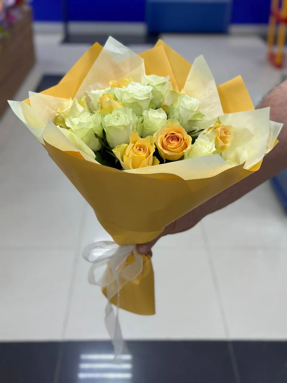Простой, но трогательный букет из белых и желтых роз – это послание, понятное без слов