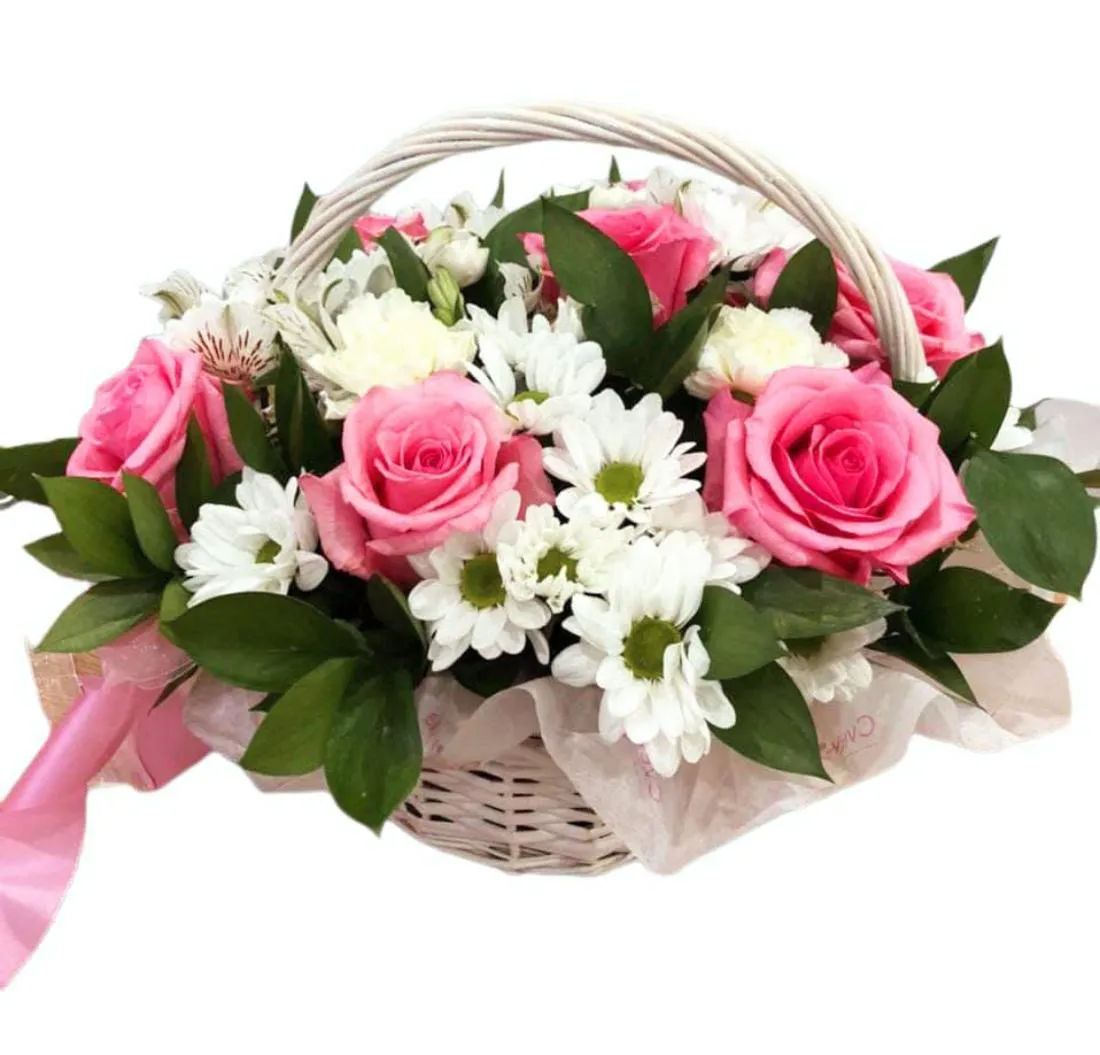 Букет в корзине из хризантем и роз Цветочные сны