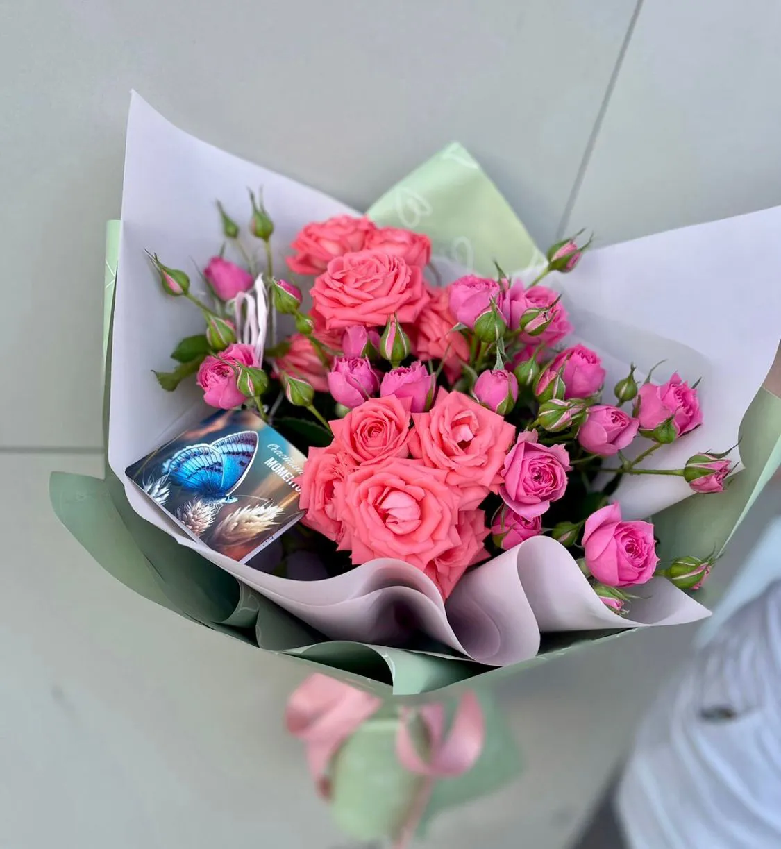Кустовая роза, зелень, упаковка, лента